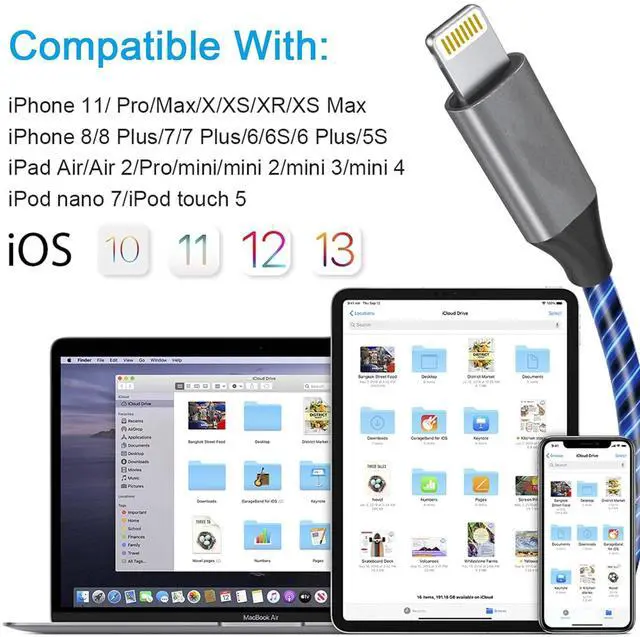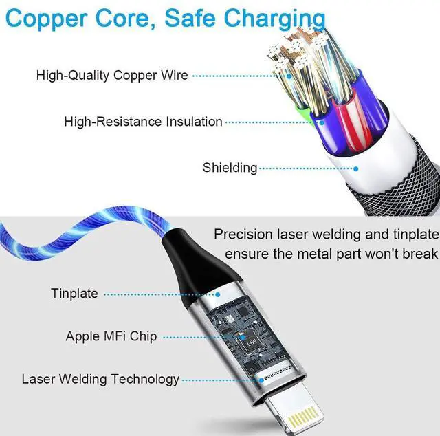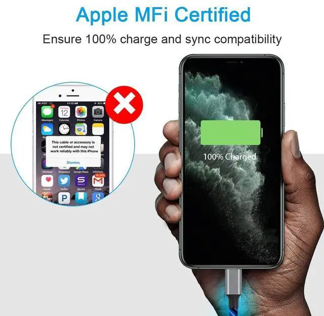 MFi Certified Durable Design: MFi Certified and built with 's upgarded terminal and smart chipset promise no warning message pops up. Reinforced charger cable with strong SR joint design for extra protection and durability. Upgraded 3D aluminum connector and exclusive laser welding technology build the lightning cable more sturdy. Perfect Compatibility--- iPhone charger compatible with iPhone 13Mini/13/13Pro/13Pro Max/12 Mini/12/12Pro/12Pro Max/11Pro Max/11Pro/11/XS/iPhone Max/iPhone XR/iPhone X/iPhone 8 Plus/iPhone 8/iPhone 7 Plus/iPhone 7/iPhone 6s Plus/iPhone 6s/iPhone 6 Plus/iPhone 6/iPhone 5s/iPhone 5c/iPhone 5/iPad Pro/iPad Air/Air 2/iPad mini/mini 2/mini 4/iPad 4th gen/iPod Touch 5th gen/ iPod as well as the latest iOS 11 12 13 system. 2.4A Fast Charge & 480Mbps Fast Sync--- High-Quality 8 Pin connector which improves the charging and data transmission speed of the iphone charging cable. The built-in MFi certified chipset ensures a faster charging time while preventing overheating and overcharging ensuring the safety of you and your device. What You Get--- 1 box-pack MFi Certified LED iPhone charging cables + One year warranty If you have any questions during the use not satisfied with our products or services please contact us by email directly we will do our best to provide you with satisfactory and friendly service within 24 hours.