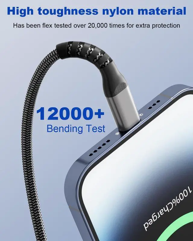 Material & Tangle-free Design: Our iPhone charging cord feature a durable nylon braided exterior with black and white stripes. Equipped with thickened copper wire they ensure optimal power delivery. Tested for over 12 000 flex cycles these lightning cable resist tangling and wear. Enhanced with 3D aluminum connectors and laser welding technology for iPhone cable the metal parts are designed to last ensuring fast charging without cracking or damageMFi Certified iPhone