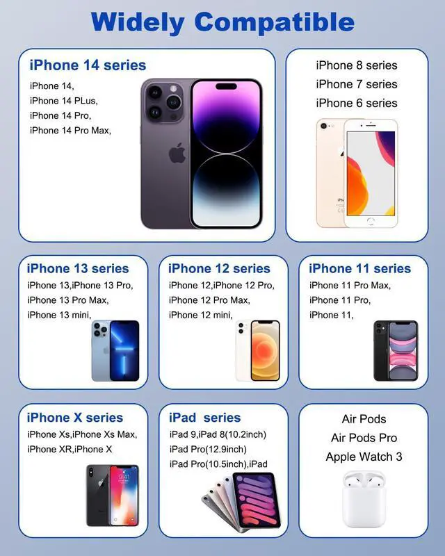 USB portsPerfect Compatibility: This iPhone cord Compatible with iPhone 14/13/12/11 all series iPhone SE/XS Max/X/XR/8 Plus/8 iPad Pro/ iPad Air/ iPad iPhone 7/7 Plus/6s/6s Plus/6/6 Plus/SE/5s/5/5c. At the same time this iPhone lightning cable also supports CarPlay and you can connect it to your car computer using this usb lightning cable (the car needs to support the CarPlay function)
