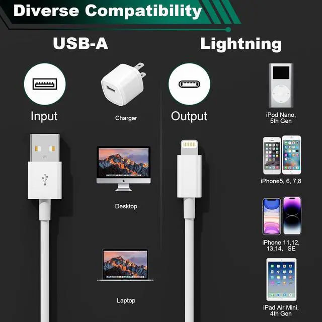 Perfect Compatibility This car carplay cable connects your iPhone 14 13 SE 2nd 12 11 Xs XR 8 7 6 All seriesiPad/iPad Air 2/Mini/Air Pods 1 2nd AirPodsDurable Charger CableOur charger cable is composed of high quality copper wire with a premium PVC. withstand at least 20 000 plugging and unplugging lifespan and 25 000 bending cyclesFast charging Lightning CableLightning cable is designed for safe and fast charging an ideal buddy for office game daily life outdoor long distance journey & business tripAfter-Sale ServiceWe provide the 24 hours email support to give you peace of mind. If you have any questions about our product please feel free to reach out to usWhat You Get1 Pack USB A to Lightning car carplay cableWhite