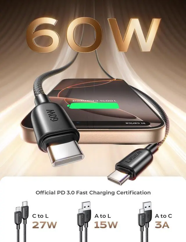 Fast Charging PerformanceEnjoy rapid charging capabilities with up to 60W when using the USB C to USB C connection, 27W with USB C to Lightning, and 12W with USB A to Lightning. The USB A to USB C connection supports a maximum current of 3A, ensuring your devices charge quickly and efficiently, so you can spend less time waiting and more time using your devices.