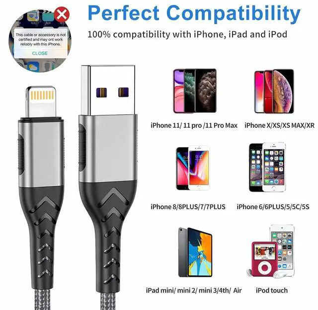 Durable Design: MFi Certified and built with iPhone' s upgarded terminal (Super durable) and smart chipset promise no warning message pops up. Reinforced charger cable with strong SR joint design that have passed 25000+ times bending tests for extra protection and durability.