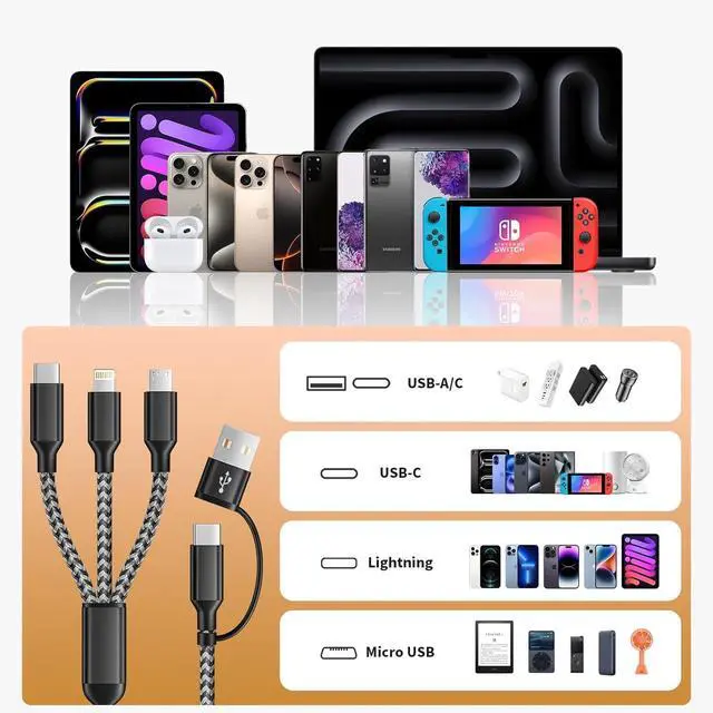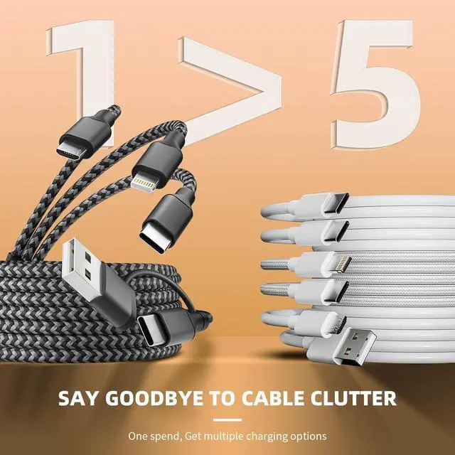 UNIVERSAL COMPATIBILITY2025 Portable travel essentials travel chargers cable. 5 in 1 Multi USB A/C charging cable compatible with all iPhone 17/16/15/14/13/12/11/SE/X/8/7/6/5 Series, Pad/Pod/Galaxy UItra/S24/s23/s22/s21/s20/s10/s9/s8/s7/s6/s5/Note 10/10/9/8 and other Android devices for most mobile phone charging. This product supports bulk purchasing, making it ideal for businesses and large orders.