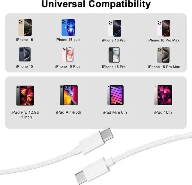 Universal Compatibility 10ft long USB C to USB C charging cable is compatible with iPhone 16/16 Plus/16 Pro/16 Pro Max, iPhone 15/15 Plus/15 Pro/15 Pro Max, MacBook Air/Pro, iPad Pro 12.9 /11, iPad Air 4/5, iPad Mini 6, iPad 10, Galaxy S24/S24+/S24 Ultra/S23/S23+/S23 UltraS/S22/S21/S20/S10 series, Pixel 8/7/6/5/4/3/2 Xl, and more USB C devices.