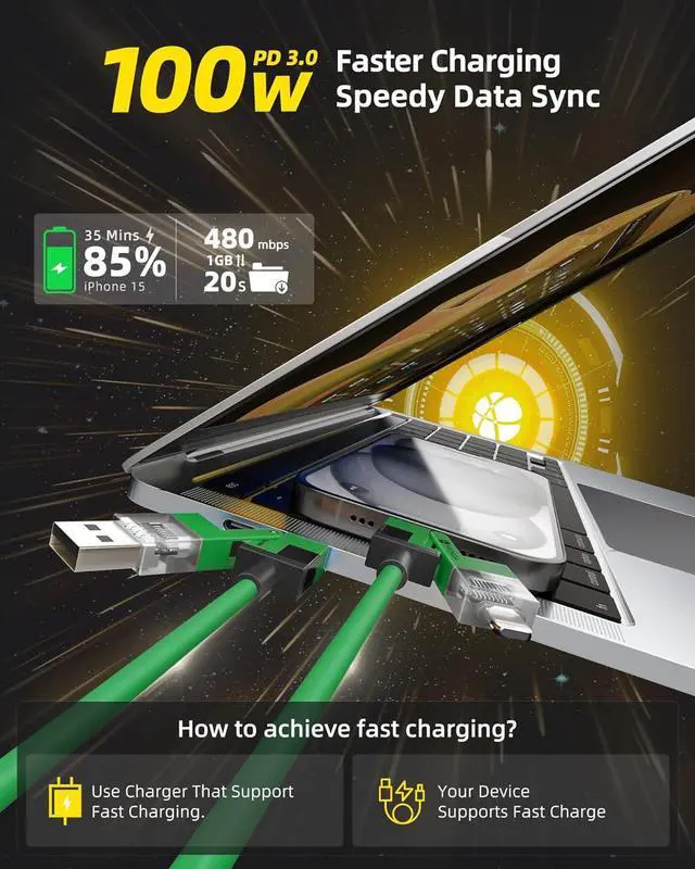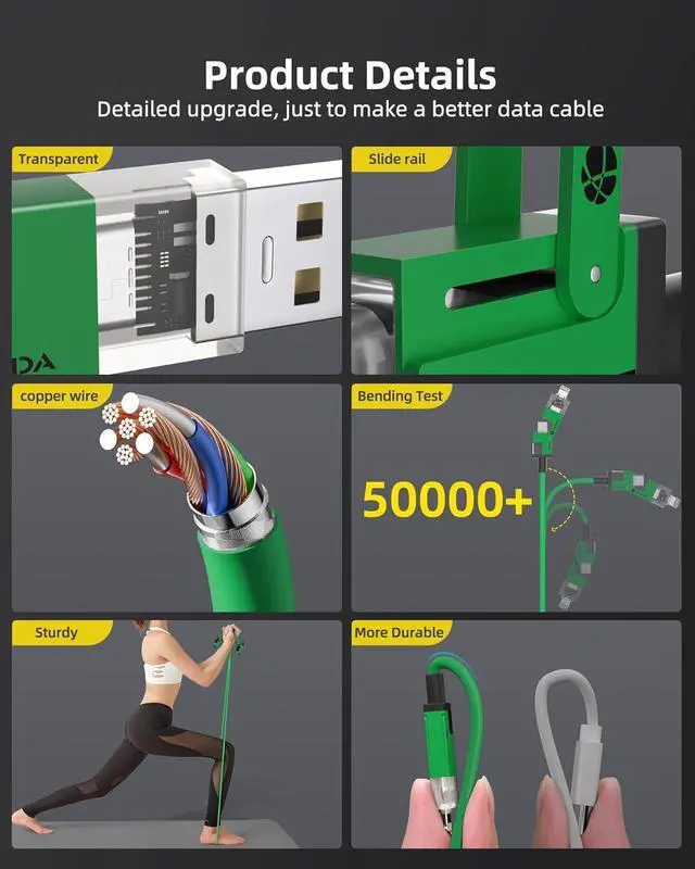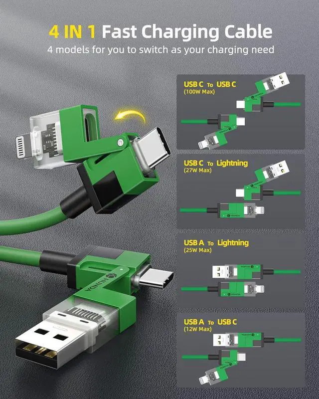 4 IN 1 Multi USB Charging CableHunda lightning cable build-in high-purity thickened copper core. ultra-low resistance charging faster, easily surpass the official, 30 minutes to charge 65%, 25 seconds to transfer 1G large files. It not only meets your need of multi-use in one line, but also solves the trouble of slow charging speed.