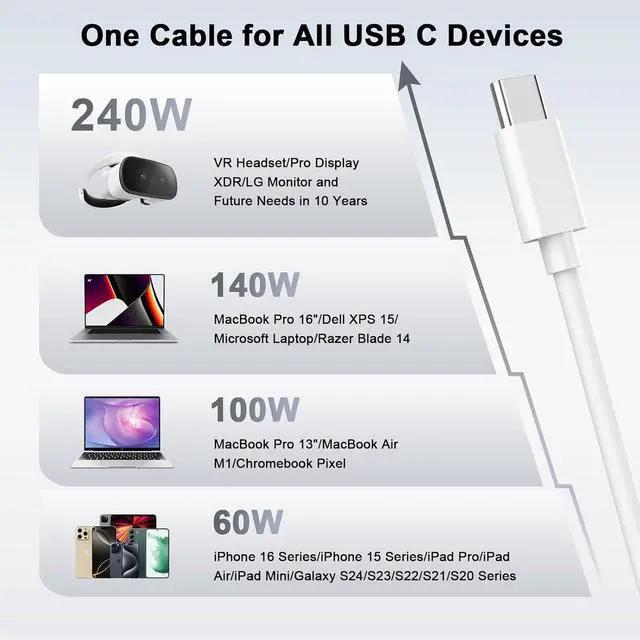 Compatibility Multiple Model 240W USB C fast charger cable is compatible with iPhone 17/17 Pro/17 Pro Max/Air, iPhone 16/16 Plus/16 Pro/16 Pro Max, iPhone 15/15 Plus/15Pro/15 Pro Max, MacBook Air/Pro, iPad Pro 12.9 /11, iPad Air 4/5, iPad Mini 6, iPad 10, Galaxy S25/S24/S23/S22/S21/S20/S10 series, Pixel 9/8/7/6/5/4/3/2 Xl, and more USB C devices.
