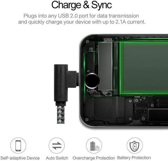 [90 Degree Design]: Specialized 90 degree right angle plug design make the cable perfect for charging & playing games at the same time. The cable' s tension, bend, swing are strictly tested, it was proved a firm and durable charging cable