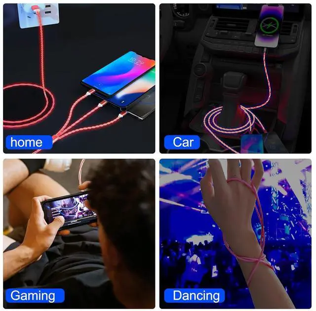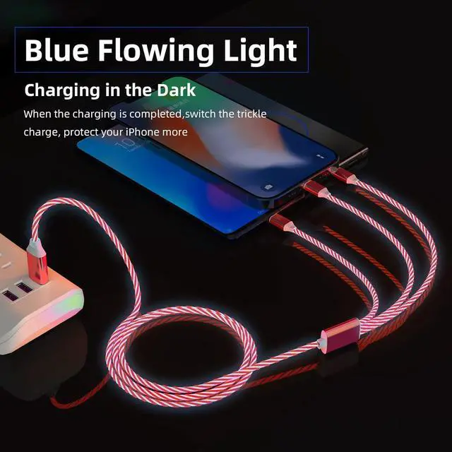 4FT 3 in 1 Charger & Safety Design Three in one charger Glowing Wire Lights iphone multi cables is simple, lightweight and portable. The cool LED lights flowing when working. With fiber-optic cable under USB cable, which makes the light stable. TPE Material is flexible strips and flexible, safe for children. Waterproof and works even if drinks spill or raindrop. perfect for home, car, office, travel, dock or sharing with friends. A must have for Uber/Lyft drivers.
