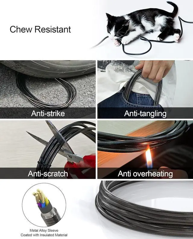 Charger Cable: This chew proof lightning cable features ultra-durable metal braided lightning cable construction. Its stainless steel exterior makes it a true cat proof iPhone cable and chew proof cord, specifically designed to withstand bites from pets like dogs, puppies, and cats.