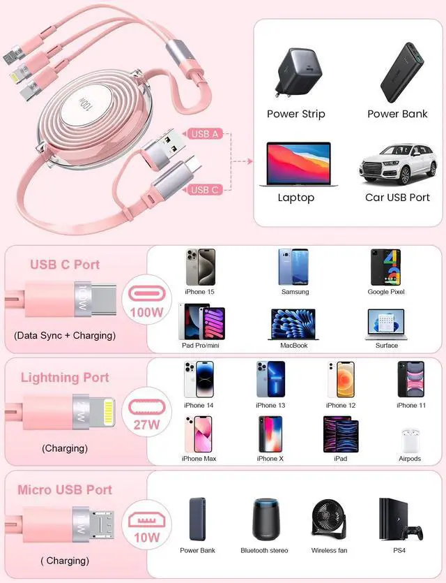 Switch to Connect: Seamlessly transition between USB C and USB A with the 2-in-1 double-input retractable phone charger and attached converter; compatible with all charger adapters featuring USB-C or USB-A ports