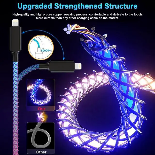 RGB Light Up iphone Charger CordRGB color gradual light up uab to Lightning Charger cable, specially ambient lights designed for you. Driving/Stay up late at night is no longer lonely. The soft light is not dazzling, and will not cause irritation or affect sleep. Always glowing, even when not charging any devices. Its a great accessory to add atmosphere.