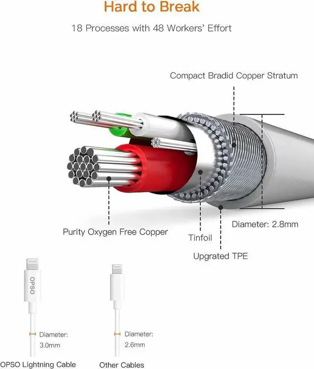 Designed with upgraded TPE material-Resists wear, tear and corrosion. The wire diameter is 2.8 mm, thicker than 2.6 mm normal cables. High speed charging with stable and efficient power output.