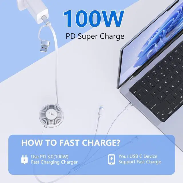 100W USB C Multi Charging CableThe retractable USB C charger cable offers charging speed up to 100W (Max), super-fast charge your Samsung Galaxy S24/S23/S22 up to 80% in 30 minutes. Say goodbye to the low battery warning