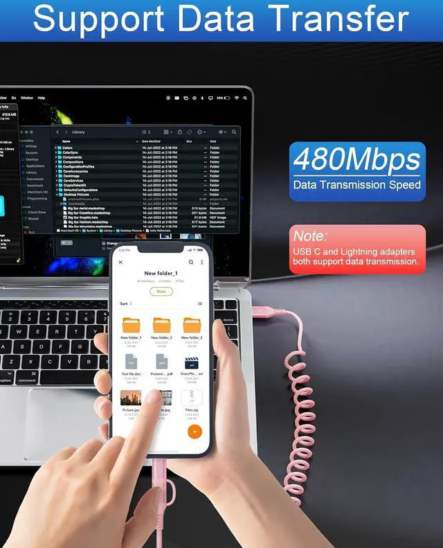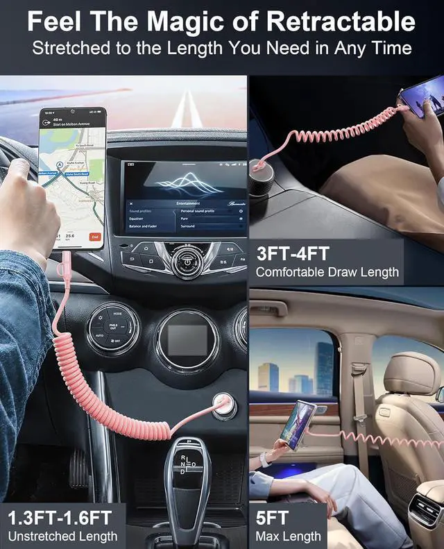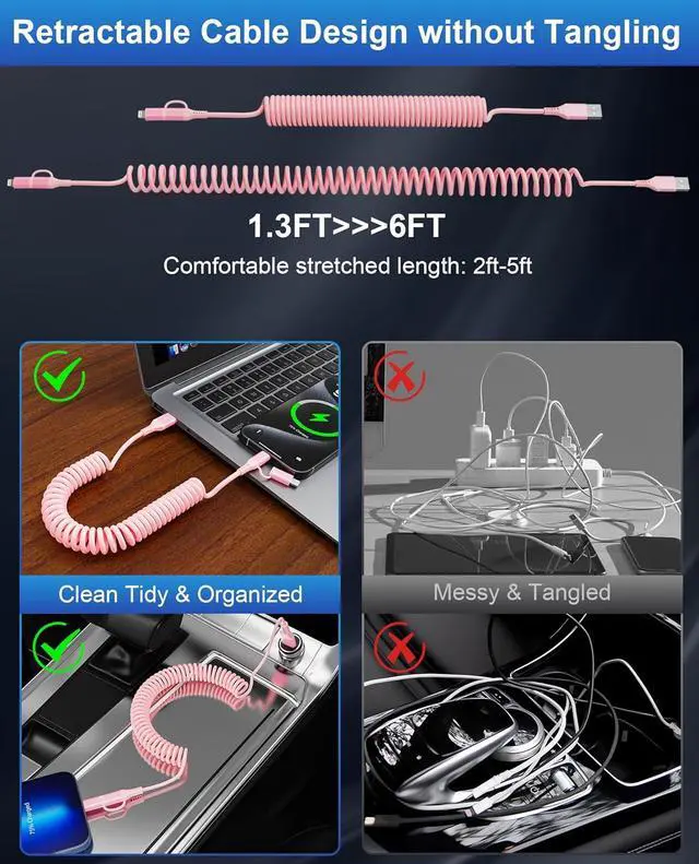 2-in-1 Coiled Design for Car & TravelDual-headed USB-C & Lightning pink car charger cable combines 2 essential cords in 1 pink coiled iphone charger cord. Perfect for Apple CarPlay & Android Auto users needing simultaneous charging and navigation. Anti-tangle coil structure (3-4FT stretched) fits car cabins or use with power banks, eliminating messy cables on road trips.
