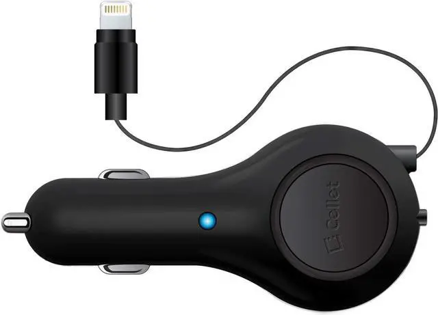 Cellet retractable car charger is easy to use, simply insert to car cigarette port and blue LED light will indicate charger is properly connected.