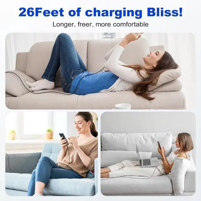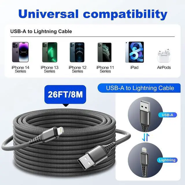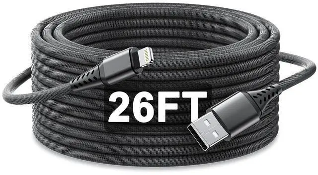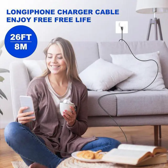 Charger: Experience unparalleled convenience with our extra-long iPhone cable, offering an impressive 26 FT length. Charge your iPhone effortlessly in any room, vehicle, or outdoor space. Our cable liberates you from short cable constraints, allowing you to move freely while your devices charge.