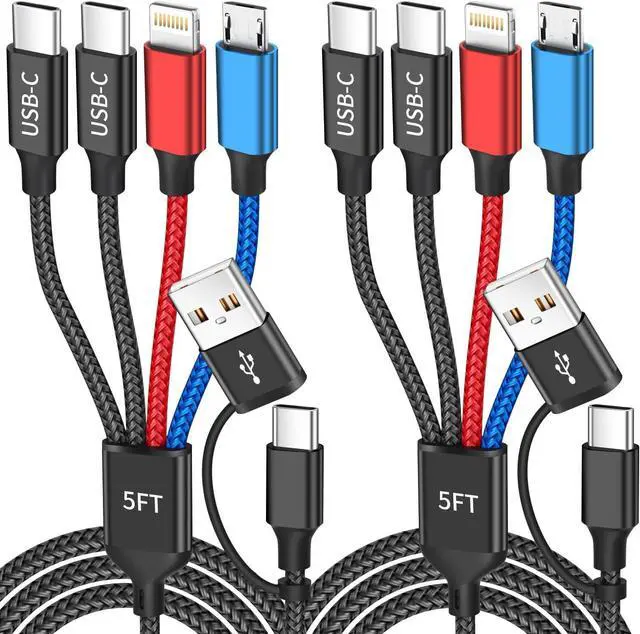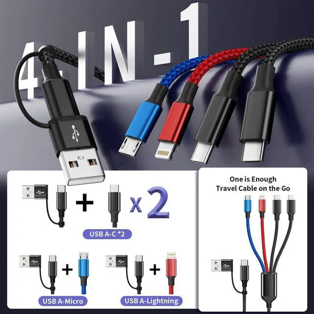 4 in 2 Multi Charging Cable with Dual Type-C Port4-in-2 multi charging cables provides 8 charging ways: USBC/USBA to dual type-c/lightn-ing/micro usb cable. Dual type-C ports design, makes usb charging cables fit all new-model devices and you can use this multi iphone/pad charger cord whether your charger adapter is USB A or USB C.
