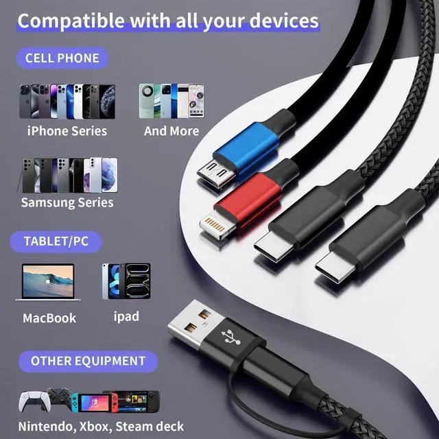 Universal Charging Cable4 in 2 charging cords for multiple devices compatible with all iPhone 17 16 15 14 13 12 11/SE/X/8/7/6/5 Series, Pad/Pod/Sam-sung Galaxy UItra/S24/s23/s22/s21/s20/s10/s9/s8/s7/s6/s5/Note 10/10/9/8, Huawei, HTC, LG, Google Pixel, Moto, Xiaomi, PS 4/5 and most other mobile phone charging, ps5 and more. (Only the lightn-ing port supports Data Transfer and CarPlay, 480 Mbps data sync).
