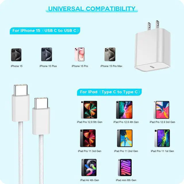 | Compatible Devices | 20w Fast charger with C to C for New iPhone 17/iPhone 17 Air/iPhone 17 Pro/iPhone 17 Pro Max/ iPhone 16/iPhone 16 Plus/iPhone 16 Pro/iPhone 16 Pro Max/iPhone 15/iPhone 15 Plus/iPhone 15 Pro/iPhone 15 Pro Max/2th AirPods Pro ,iPad Pro 12.9/11 in with USB-C connector,USB C to C iPad Pro 12.9 inch 6th Generation (2022)/ iPad Pro 12.9 inch 5th Generation (2021)/ iPad Pro 12.9 inch 4th Generation (2020) / iPad Pro 12.9 inch 3th Generation (2018)/ iPad Pro 11 inch 4th Generation (2022) / iPad Pro 11 inch 3th Generation (2021)/ iPad Pro 11 inch 2th Generation (2020) / iPad Pro 11 inch 1th Generation (2018)/ iPad Air 5th Generation (2022) / iPad Air 4th Generation (2020) / iPad Mini 6th Generation (2021)/ iPad 10th Generation (2022), USB-C connector device,Samsung Galaxy Z Fold 3 5G/S21/S21 Ultra/S21 plus 5g/ S20/ S20+/ S20 Ultra/ S20 FE (Fan Edition) 5G/Note 20/ Note 20 Ultra 5G/ Note 10/ 10 plus. -Google Pixel/Pixel 2/Pixel 3/Pixel 4/Pixel 5/Pixel 6/Pixel XL/Pixel 2XL/Pixel 3XL/Pixel 4 XL/Pixel 5a/Pixel 6Pro. and more USB-C device. |