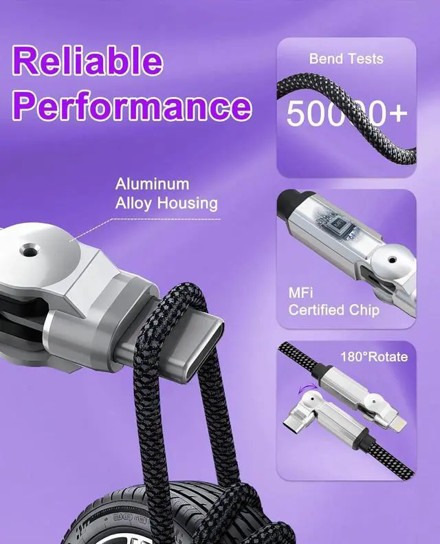 Nylon-Braided Construction: Built to last our swivel iphone cable features military-grade nylon braiding that withstands 35 000+ bend tests and daily wear. The 90 degree lightning cord includes an aluminum alloy connector that resists heat and corrosion while the generous 6.6 ft length provides flexibility for home office or car use.