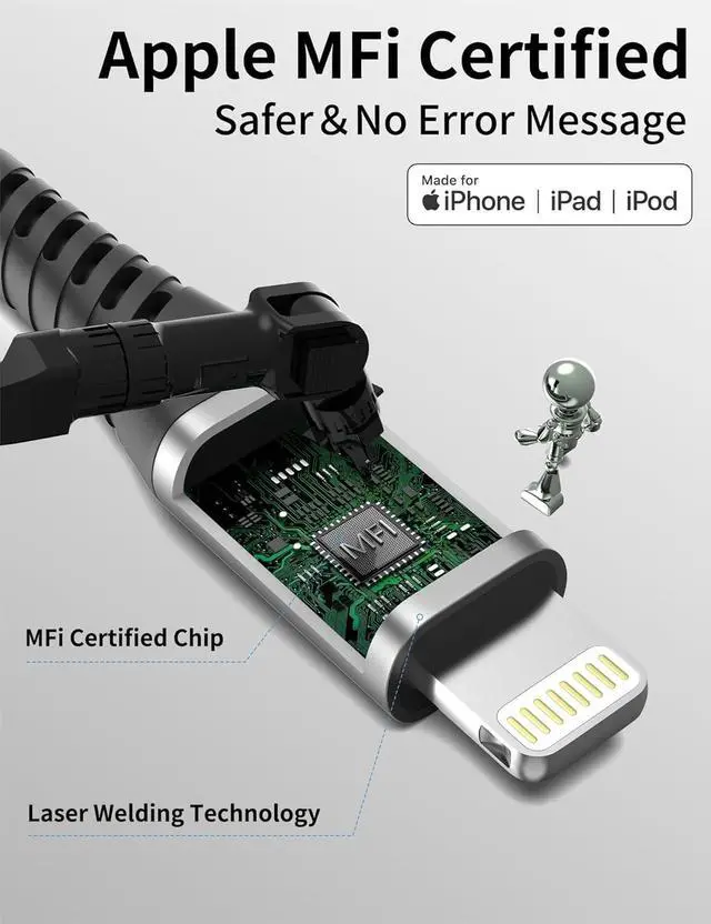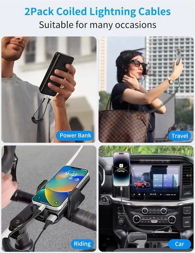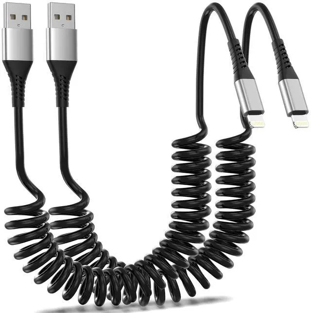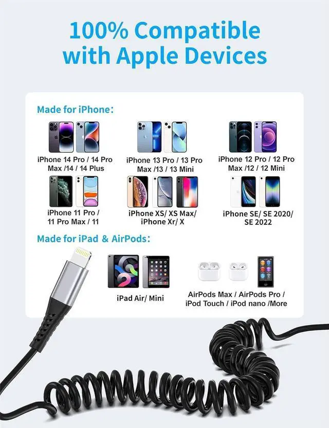 (Note: Maximum stretch limit is 3FT and the spring may feel a little tight initially)MFi Certified & Support CarPlayEach Coiled Charger Cable is built-in with an original chipset to ensure 100% compatibility with your iPhone and be able to connect to the vehiclescomputer to initiate CarPlay effortlessly. 2.4A Fast ChargingData SYNCHigh-quality tinned copper wire maximizes fast and stable charging supports 2.4A fast charging speed and 480 Mbps high data transmission which can greatly saving your time. Elastic Lightning CableThe elastic lightning cord is designed to stretch from 1 foot to 2.5 feet and up to 3 feet. Stretching to limiting distance for a long time may reduce elasticity. Convenient for charging your devices in the bedroom on the sofa in the office while travelling. (Due to the coiled design may be a little tight for the first time. )Wide CompatibilityCoiled USB A to lightning cable suit for all the devices with Lightning Port like iPhone 14/14 Pro/14 Pro Max/14 Plus/13/13 Pro/13 Pro Max/12/12 Pro/12 Pro Max/12 Mini/11/11 Pro/11 Pro Pax/SE 2022/XR/XS/XS Max/X/8/8 Plus/SE/SE 2020/SE 2022 iPad Pro/Air /mini. What You Get2 Pack Retractable iPhone Fast Charger Cables. All cables you purchase enjoy our 24-month worry-free returns warranty and lifetime 24/7 customer service.