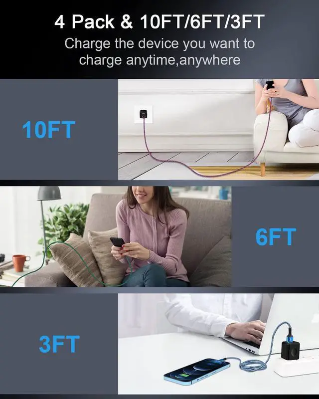 Transfer speed up to 480Mbps can help you work efficiently. MFi Certified-MFi lightning cable suitable for IOS versions with resistance-resistant aluminum alloy connectors to ensure that your device is charged quickly and safely and transmits data stably. Durable Material-iPhone cable With 20 000+ Times bend tests the nylon braided cable is more flexible. Covered with superior aluminum housing and a braided-nylon jacket make the cable more durable and also protect against physical stresses. What You Get-iPhone charger cable [3ft/4-Pack] with 7x 24 Hours friendly customer service A Worry-free 1-year warranty. If you have any questions please feel free to contact us.