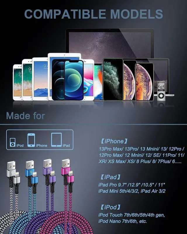 Universal Compatibility-Lightning cable fast charging for iPhone Charger widely compatible with iPhone 14/14 Pro/14 Pro Max/14 plus/13/13 Pro/13 Pro Max/13 Mini/12/12 mini/ 12 Pro/ 12 Pro Max/11/11 Pro/11 Pro Max/ XS Max/ XS/ XR/ X/8 Pad Pro 10.5 /Pro 9.7 /Mini (2019) /Mini 3/Mini 2/Air Pod Touch 7th/6th/5th/4th gen Pod Nano 7th/6th and other IOS versions. Please make sure you need USB C CABLE to charge Pad Air 2020 10.9 (4th Generation) Pad Pro 12.9 Gen3/Gen4 and Pad Pro 11Fast Charging and Data Transfer- iPhone Cable supports high-quality rapid charge up to 2.4A charging speed faster and safer charging time savings.