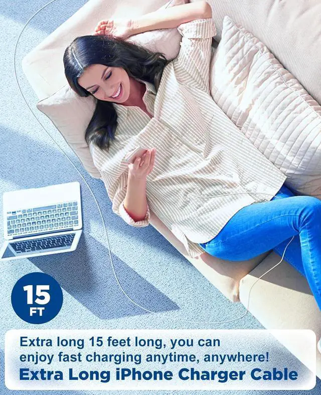 Long Lightning Cable: 15 ft extra long iphone charger cord supports power delivery for fast charging while keeping your device safe. The 15ft iphone charging cable also supports data transfer up to 480mbps for efficient transfer of music files pictures and videos in a short time. The charging speed is 40% faster than ordinary cables which ensures 100% matching of products in terms of performanceExtra long iPhone