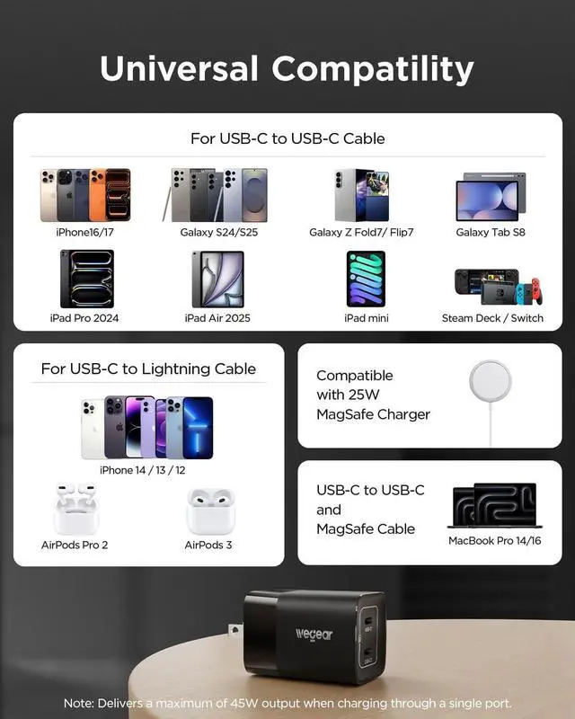 Universal Compatibility and Reliability: Compatible with MacBook Air iPad Pro iPhone 17-8 Series Galaxy S25 Ultra-S10 Series Pixel Switch and more USB-C devices. Include the Wegear 45W Charger welcome guide 18-month warranty and dedicated customer support (cable not included).
