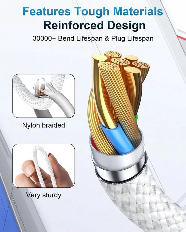 Durability Charger cord: This iPhone charger cable is made of nylon braided material resists both fraying and kinking better than ordinary iPhone charger cable. These lightning cables proven to withstand over 30 000 bends in strict laboratory tests. And charging cable adopts copper wire to maximize signal quality and durability. The USB C to lightning cable can withstand daily connection needs and long-term use.