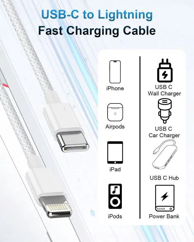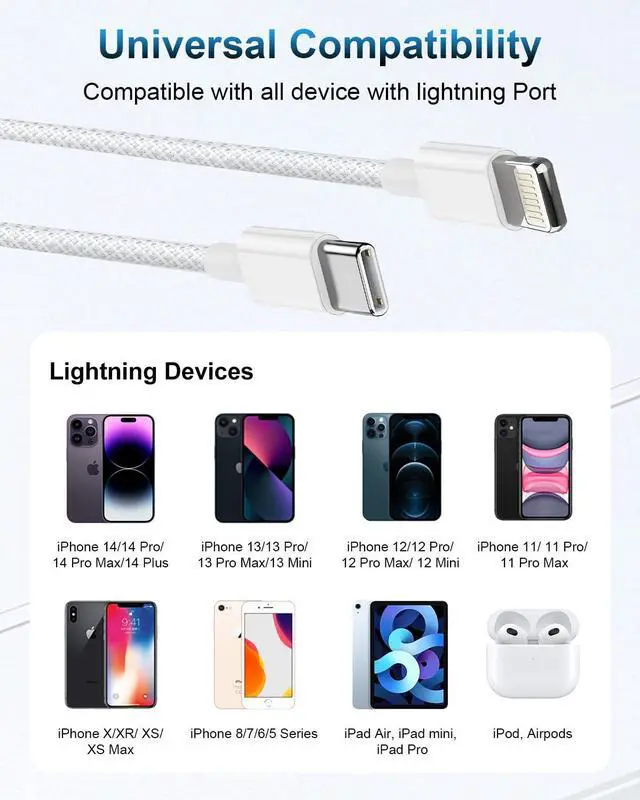 Wide Compatibility iPhone charging cord: The charger cord support power delivery fast charge for iPhone 14/14 Pro/14 Pro Max/14 Plus/ iPhone 13/13 Pro/13 Pro Max/13mini/iPhone 12/12 Mini/12 Pro/12 Pro Max/11/11 Pro/11 Pro Max/XS Max/XS/XR/X/8 Plus/8 and iPad 8th iPad 2020 iPad Pro 12. 9gen1/ gen2/iPad Pro 10.5 /iPad Air3 10.5 /iPad mini5 7.9 and more.