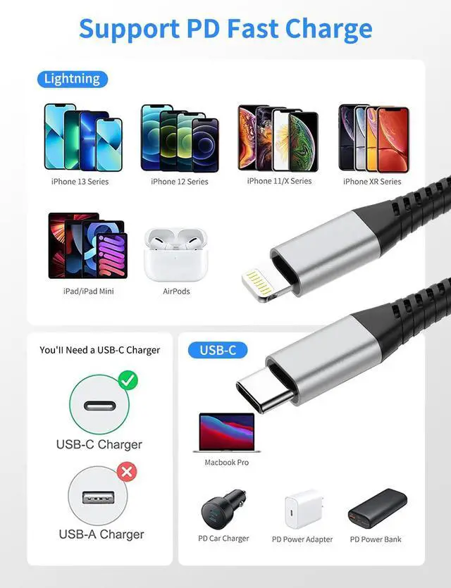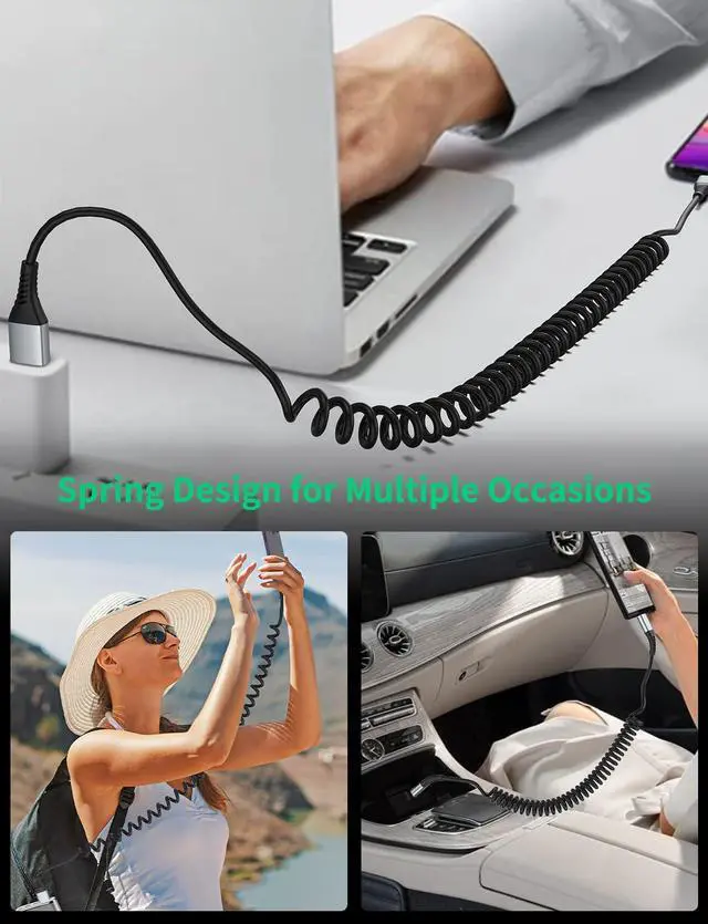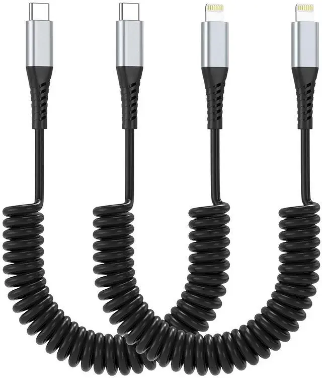 iPhone Cable for CarPlayRetractable USB Type C to lightning cable is designed with a retractable spring shape no twisting no knotting stretching freely. Suitable for the front seat of the car effectively saving space and reducing clutter. Flexible Length The length of coiled lightning cable USB C in its unstretched state is 1feet the effective stretched length is 1.5 ft to 2 ft Flexible length for a variety of situations easy to carry does not take up space ideal for travel use. Fast Charge and Data Sync Coiled USB C iPhone charger cord has a built-in MFi certified chip that provides 3A safe and fast charging and 480Mbps high speed data transfer.