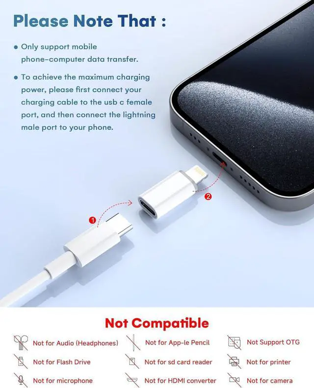 Charging & Sync): This usb c to lightning cable adapter is designed specifically for charging and data sync between phone and computer. Please note that it does NOT support OTGOn-The-Go Android devices Headphones CarPlay Card Reader USB Flash Drive MIDI Keyboard Mouse U Disk Hubs Microphone etc