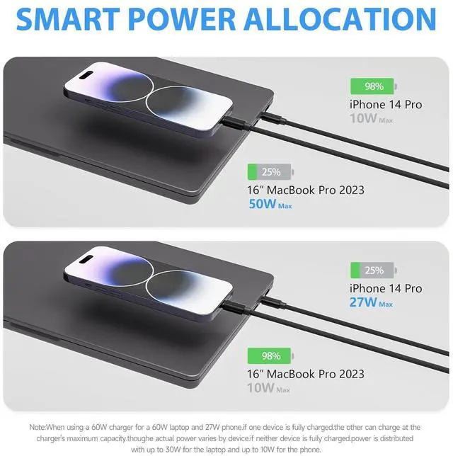 It supports a total power delivery of up to 100W with smart dynamic power distribution to optimize speed for both connected devices such as a laptop and a phone. (Please use a charger with a power of 100W or higher. The charger is not included. Smart Dynamic Power Sharing Our 2 in 1 multi charger cable Equipped with an intelligent power management chip the cable automatically and safely allocates the maximum available power between the two ports. For example the 2 in 1 multiple charger cord can deliver 70W to a laptop while simultaneously providing 30W fast charging to a smartphone.