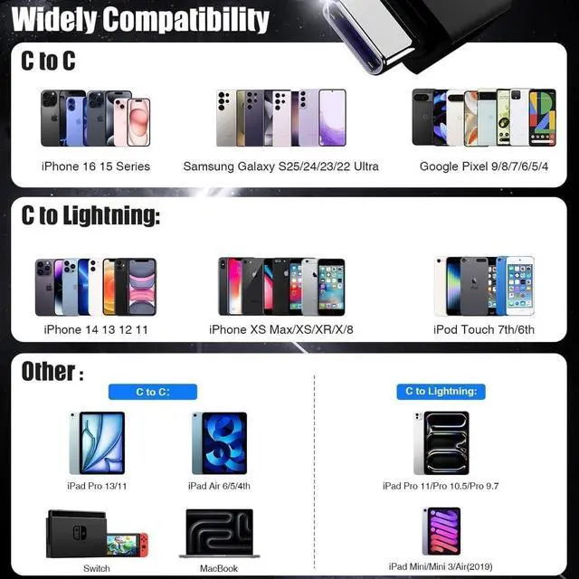 Wide Compatibility: This 2 in 1 USB C to USB C/Lightning Cable 10ft is fully compatible with iPhone 17/iPhone 17 Air/iPhone 17 Pro/iPhone 17 Pro Max/iPhone 16/iPhone 16 Plus/iPhone 16 Pro/iPhone 16 Pro Max/iPhone 15/iPhone 15 Plus/iPhone 15 Pro/iPhone 15 Pro Max/iPhone 14/14 Plus/14 Pro/14 Pro Max/iPhone 13/13Mini/13 Pro/13 Pro Max/iPhone 11/11Mini/11 Pro/11 Pro Max/XS/XR/X/8/8 Plus/7/7 Plus/6s/6/6 Plus iPad Pro/Pro 2 iPad Air/Air 2/Air 3 iPad Mini 3/Mini 4/Mini 5.