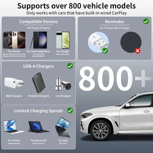 Carplay Connectivity for iPhone 16/15Specifically designed for in-car use this iPhone 16/15 charging cable instantly activates Car Play when plugged into your device. This Carplay cable provides smooth playback and fast response when using the Carplay function. Whether you're playing music or using navigation you'll experience optimal performance. 6.6F t iPhone 16 15 Car Carplay CableThis USB A to USB C fast charging cable Compatible with iPhone 16 16Plus 16 Pro 16 Pro Max iPhone 15 15Plus 15 Pro 15 Pro Max MacBook Pro 13 inch Macbook Air 13 /m1 Inch MacBook 12 inch iPad Pro 12.9 /11 inch iPad Air 4/5 iPad Mini 6 Google Pixel 6/6 Pro/5/5a for Galaxy S24/S23/S22/S21/S20/S20+/S20 Ultra Galaxy A53/A73/A71 Galaxy Note 10/10+/20 Ultra Switch PS5 and other USB-C port devices.