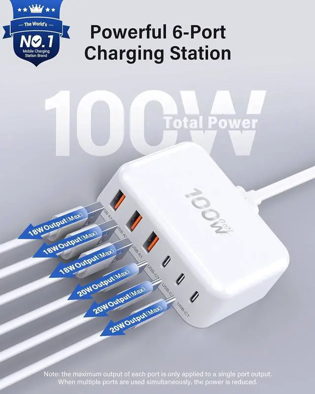 ? Fast-Speed Desktop Charging StationOnly 30 minutes charge your phone to 60%. 6 in 1 Charging blocks with 3 x USB C PD 3.0 port (20W max) 3 x USB port (18W max) this charger supports a maximum output of 100 watt in total. No need to wait it can charge your watch earphone mobile phone fan and other 6 different devices at the same time? Universal CompatibilityUSB-C port and USB-A port charger block for iPhone 17 16 15 14 13 12 11 Pro Max Mini Plus/ XS Max/ XS/ X/ XR/ 8 Plus/ 8 iPad Pro Air Mini AirPods Pro Galaxy S23/S23+/S23 Ultra/ S22/ S22+/ S22 Ultra/ S21/S21+/S21 Ultra/ S21+ 5G S20/ S20 Ultra/ S20+/ S20 FE Note 10/ Note 10 5G Note 20/ 20 Ultra 5G/ S10 5G Galaxy Z Fold 3 5g A90 5G A80 A70 Book S Tab S7/S7+/S8/S8+/S8 Ultra and switch fan speaker lamp etc.