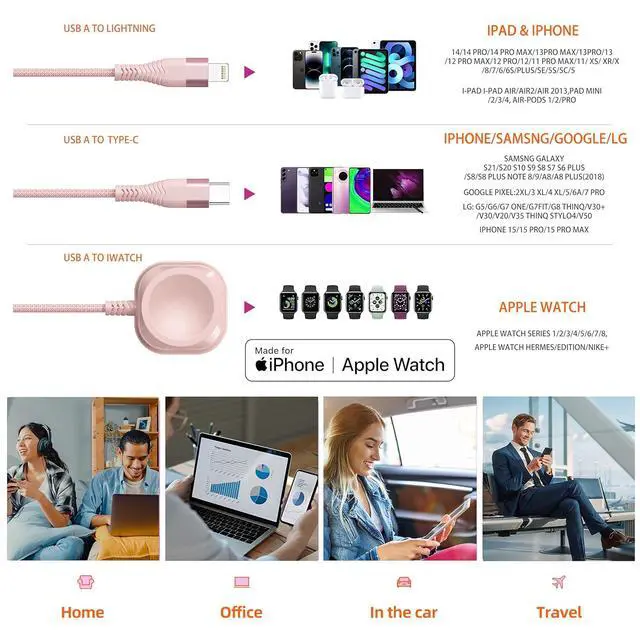 Charging Cable: Charging with 4 in 1 charging cable Watch charging cable iPhone charging cable and Type C charging cable in one sleek design. Essential for charging multiple devices at once and busy lifestyles. Nylon braided body and aluminum shells ensure durability while USB to lightning cable and USB C to A cable connectors make it compatible with iPhone charger cord iWatch charger Micro and USB C cablesMagnetic iWatch Charging with