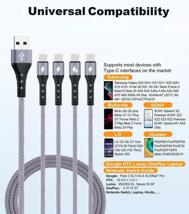 Proven Compatibility: The multi usb c cable 4 in 1 has been precision engineered to provide a secure and reliable fit with any USB-C device. Our rigorous In-house tests confirm seamless physical compatibility with all tested devices including all the USB C Phones Tablets and virtually any flagship Notebooks Nintendo Switch and more.??