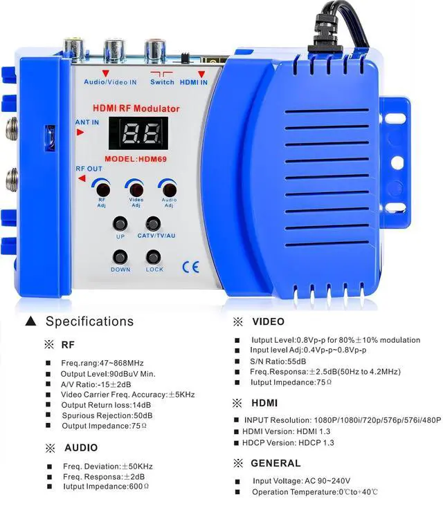 HDMI to RF modulator supports both VHF and UHF frequencies, and HDMI and CVBS RCA inputs