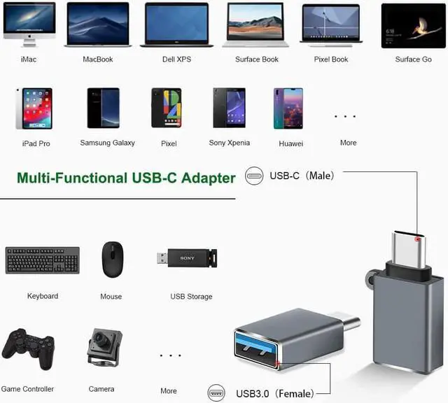 Wide Compatibility: The USB C to USB A adapter Compatible with MacBook Pro 2021/2020/2019/2018/2017/2016 MacBook 2018/2017/2016/2015 iPad Pro 2020/2018 Pixelbook Galaxy Book Pixelbook Dell XPS 15 / XPS 13 Surface Book 2 Samsung Galaxy S8/S9 and many other smartphones/laptops/tablets (more details in description).