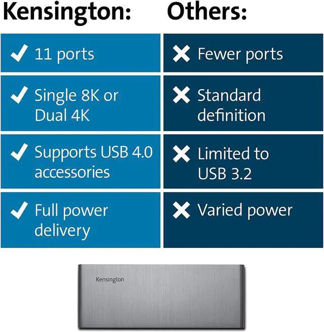Designed exclusively for Surface, the SD5750T Thunderbolt 4 Dual 4K Dock (DFS) offers premium Thunderbolt benefits now, and well into the future. Compatible with USB4/Thunderbolt 4-enabled Surface laptops, supports USB-C and USB-A accessories, and provides full power delivery regardless of how many devices are connected. Features include 11-ports [four Thunderbolt 4, four USB-A (one 5V/1.5A charging port on the front and three Gen2 @ 10Gbps ports on the rear), one Gigabit Ethernet port, one audio combo jack, and one UHS-II SD 4.0 card reader], Single 8K @ 30 Hz, or up to Dual 4K @ 60Hz video, 40Gbps data transfer speeds, secure and manageable Intel VT-d DMA protection, a zero-footprint mounting option, security cable lock slots, free Kensington DockWorks software, and a three-year warranty.