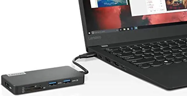 Bring unlimited productivity with you wherever you travel with the Lenovo USB-C 7-in-1 Hub. This compact little USB hub gives you one-stop docking at home or on the go with a variety of ports so that you're ready for whatever life throws at you. It even features a USB-C power bypass, so you can power any notebook that uses a 45with65W USB-C power adapter while the port hub is plugged in. Measuring just 2 inches wide and 4. 2 inches long, the Lenovo USB-C 7-in-1 Hub is smaller than a standard index card (although it's a little thicker at 0.