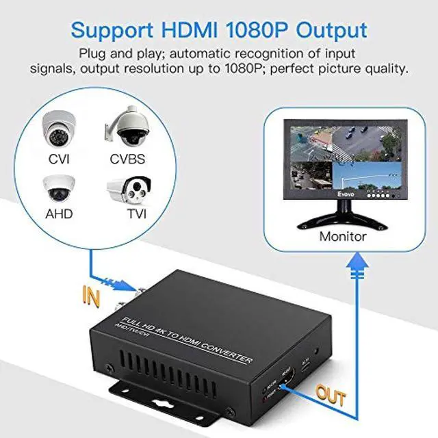 Features: 1. CVI/TVI/AHD+CVBS to HDMI. HDMI output 1080P/60FPS. Connected to HDMI output, HD-LINK indicator is always on, yellow light. Plug and play; automatic recognition of input signals.