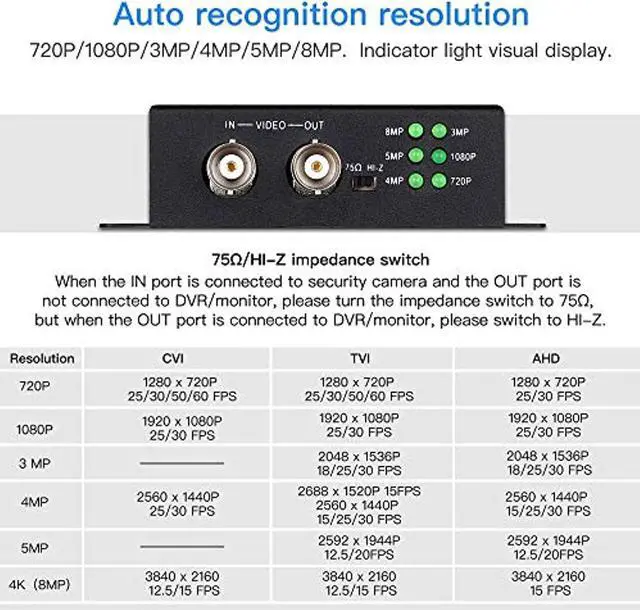 5. Auto recognition resolution. 720P/1080P/3MP/4MP/5MP/8MP. Indicator light visual display.