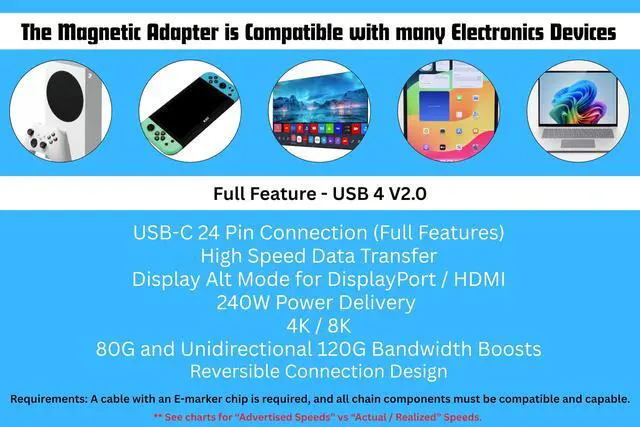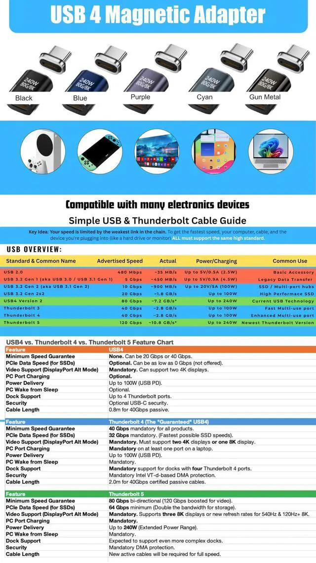 The Magnetic Full-Function Adapter is a high-performance USB-C adapter designed for ultra-fast data transfer, high-power charging, and seamless multi-device compatibility. Featuring an 80Gbps transmission speed, 240W power delivery, and 8K@60Hz display support, its ideal for professionals, gamers, and tech enthusiasts. Its N52 magnetic plug ensures a secure connection, and the aluminum alloy casing adds durability. Compatible with a wide range of devicesfrom laptops and phones to tablets and gaming consolesthis adapter comes in multiple colors and includes an E-Marker smart chip for safety and efficiency.