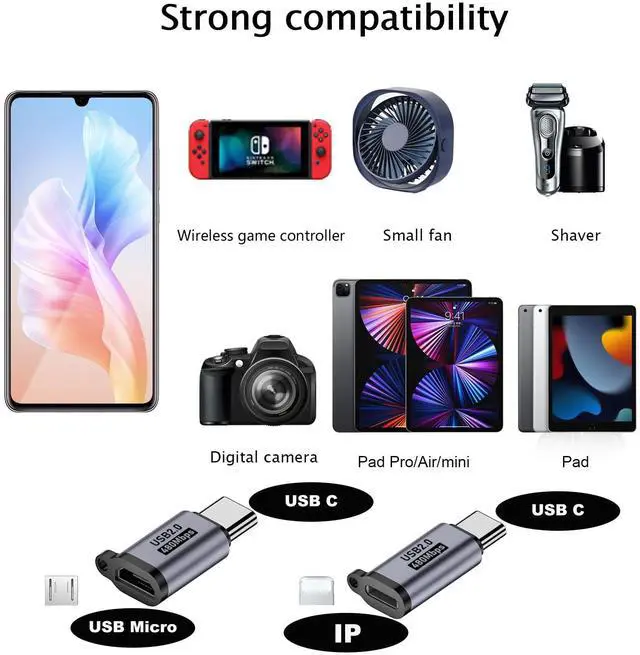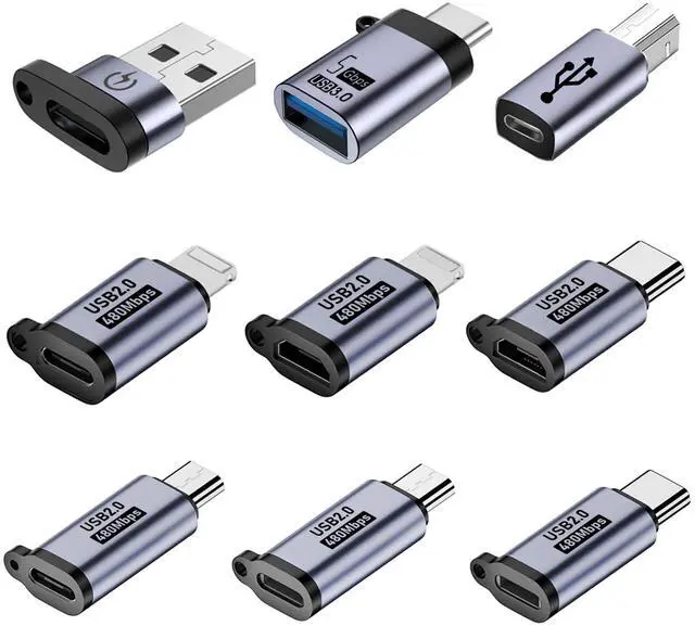 [9 adapter types]: With nine different design adapters, you can easily connect devices with USB C/Micro USB//USB B ports to USB C cables, Micro USB cables, or Ligh cables for charging and data transfer.