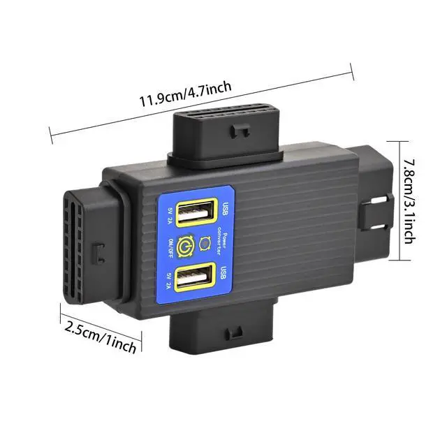 Equipped with two USB charging ports, this adapter lets you conveniently charge your devices while utilizing OBD functionalities. Keep your phone, tablet, or other gadgets powered up on the go, ensuring connectivity and productivity wherever you are.
