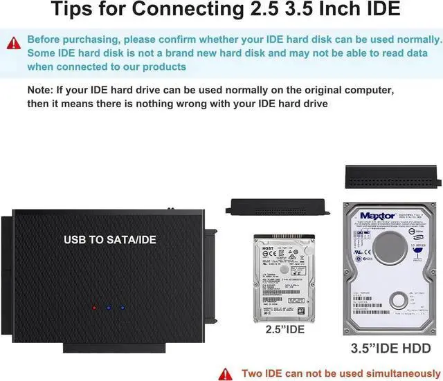 HDDs: This USB 3.0 to IDE and SATA adapter is equipped with a SATA III connector and 2 IDE connectors (one 2.5 and one 3.5 ). It allows users to operate 2 HDDs (One IDE and One SATA ) simultaneously. Its compatible with 2.5 / 3.5 IDE/SATA hard drivesHigh