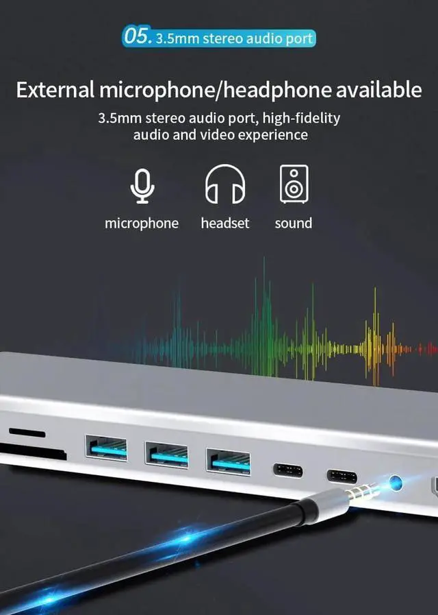 This laptop docking station is perfect for your Microphones, Headsets, Headphones, and Speakers.